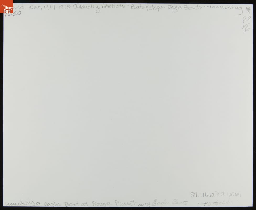 During the First World War, Ford built Eagle anti-submarine patrol boats at a new plant on the Rouge River. The company assembled the boats on massive flatcars that rolled through the factory. Ford launched Eagles into the river with a hydraulic steel trestle that lowered each hull into the water like a giant elevator. The process took about 40 minutes.