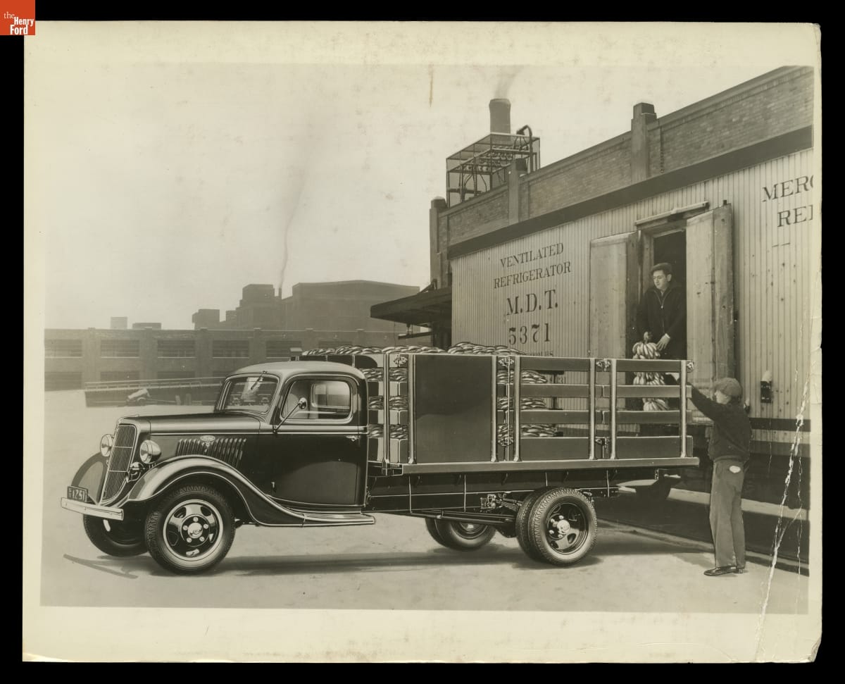 Ford's 1934 trucks were only slightly changed in appearance from the previous model year, though the blue oval logo was added to the side of the hood. The stake body version was particularly versatile. The racks were removable to ease loading or accommodate oversized cargo. The boxcar pictured here belonged to Merchants Despatch Transportation Company, which operated some 12,000 refrigerated railcars.