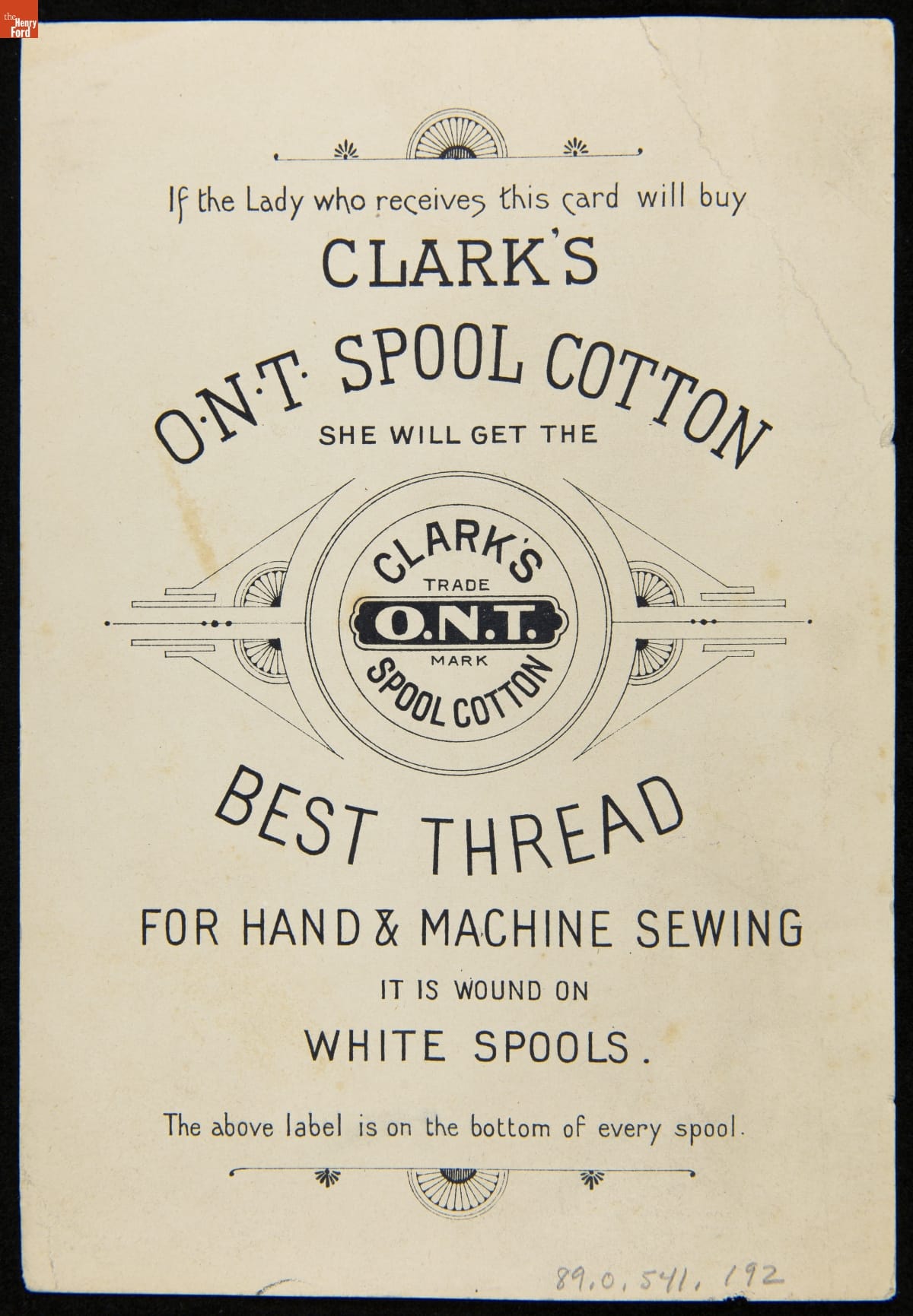 Trade Card for Clark's O.N.T. Spool Cotton Thread, 1880-1890