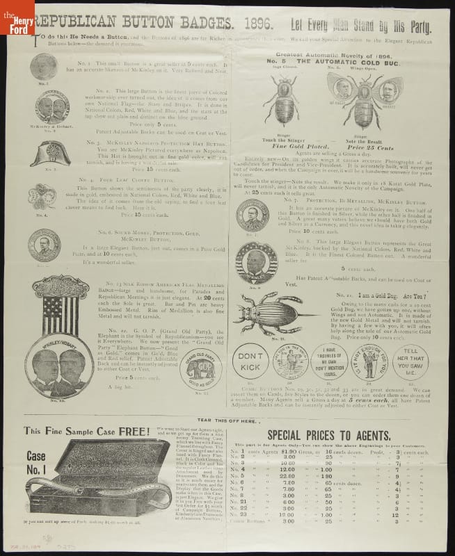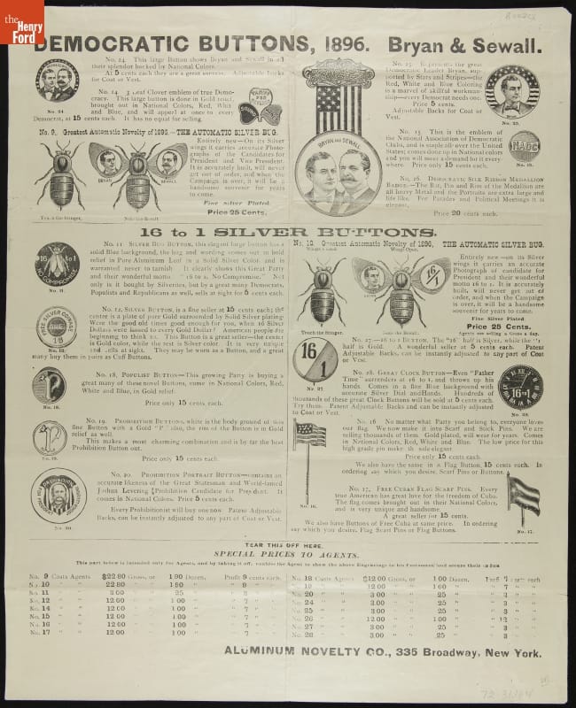Handbill of Democratic Party and Republican Party Political Buttons for Sale, 1896