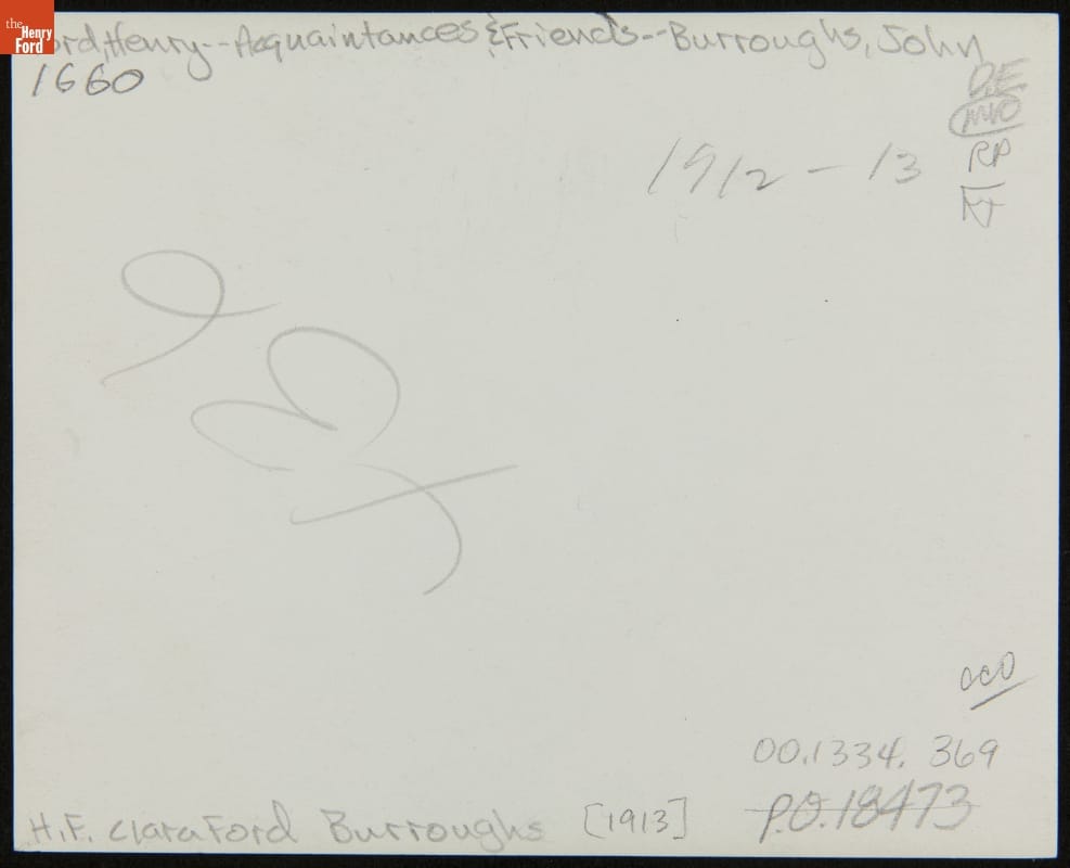 Henry Ford read and admired the works of John Burroughs. In the early 1910s, Ford sought out the internationally known naturalist and writer. The two bonded over their love of birds and nature and became friends. Ford and Burroughs often visited each another and went on extended vacations with family and other acquaintances.