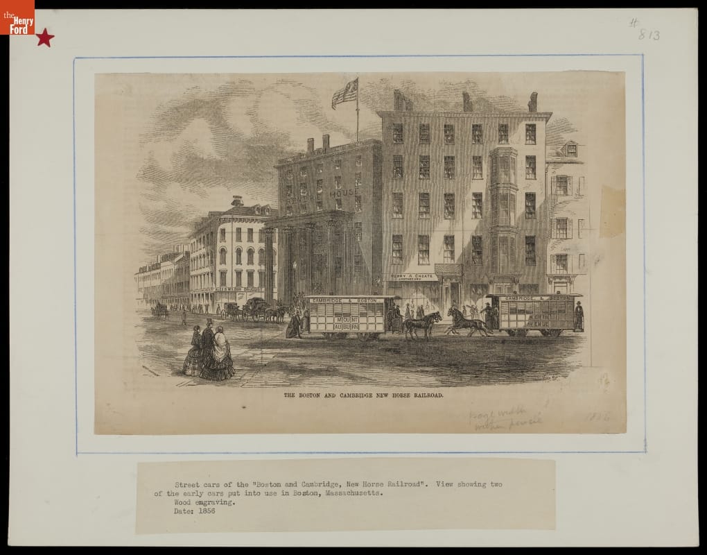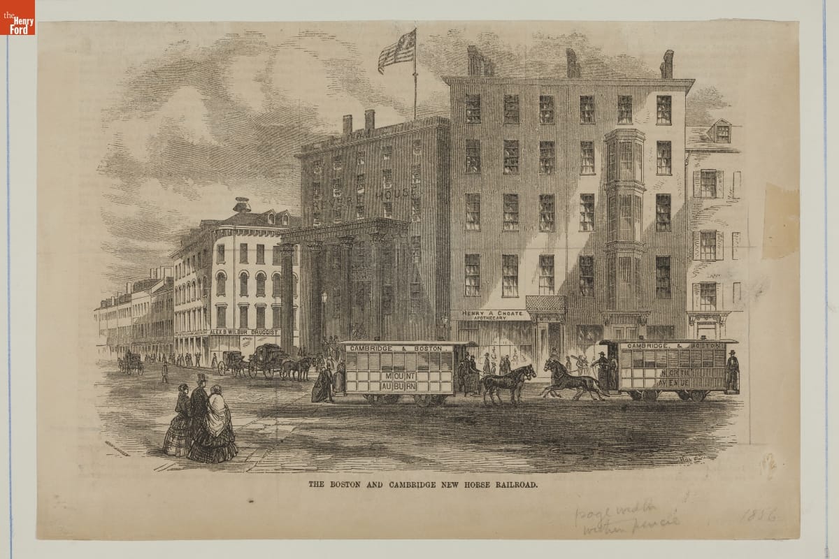 This wood engraving depicts the early horse-drawn railroads in 1856 that ran from Boston through Cambridge to Mount Auburn in Massachusetts. The print was originally engraved by printmaker John Andrew for the publication "Ballou's Pictorial."