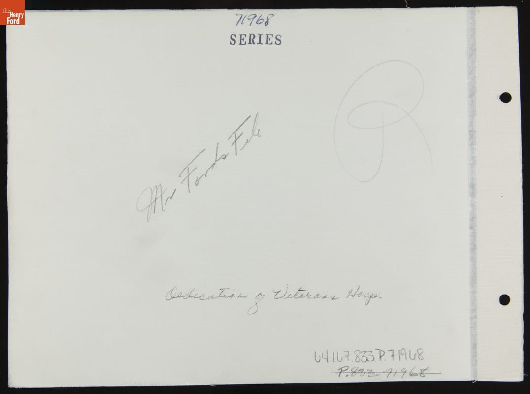 Clara and Henry Ford donated land in Allen Park, Michigan, for a veterans hospital. Ground was broken in 1937, and the facility opened two years later. Expanded multiple times after World War II, the hospital ultimately was replaced by an all-new facility in nearby Detroit in 1996. The original Allen Park VA Medical Center buildings were demolished starting in 2002.