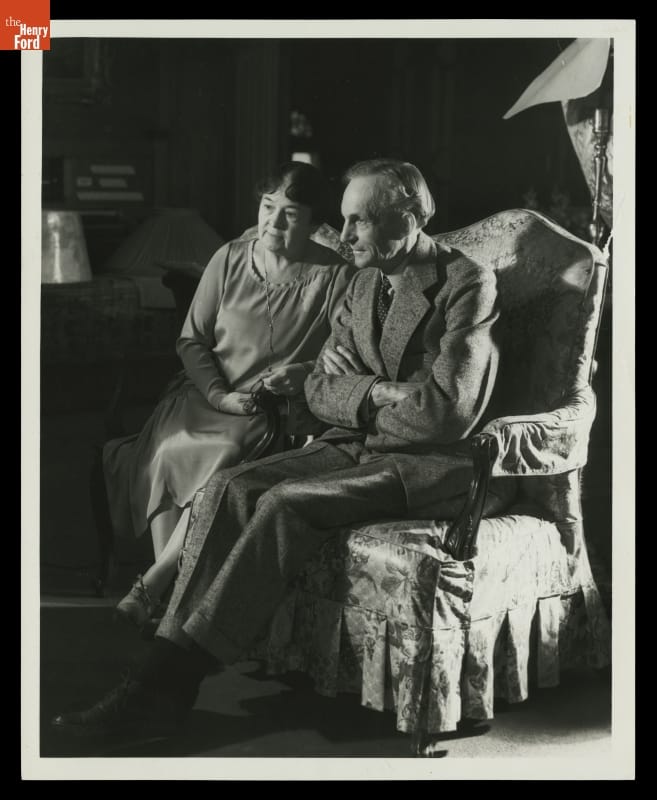 In the 1910s, many of Detroit's wealthy citizens abandoned the city for eastern suburbs. Henry and Clara Ford sought a different path. They selected 1300 acres of farmland in Dearborn (west of Detroit) as the site for their new estate, called Fair Lane. The couple posed for this photograph, taken in their living room in 1932.