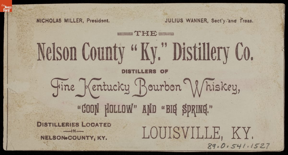 Trade Card for Fine Kentucky Bourbon Whiskey, Nelson County "Ky." Distillery Co., 1883-1902