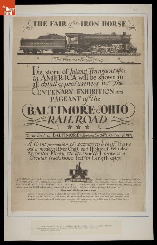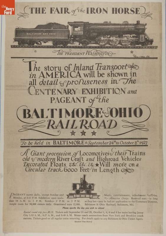 The Baltimore & Ohio Railroad, the country's first common-carrier line, celebrated its centennial in 1927 with a grand exhibition called "The Fair of the Iron Horse." Some 30 contemporary and historic locomotives -- including the DeWitt Clinton replica now in The Henry Ford's collection -- traveled to suburban Baltimore to participate in the pageant celebrating 100 years of American railroading.