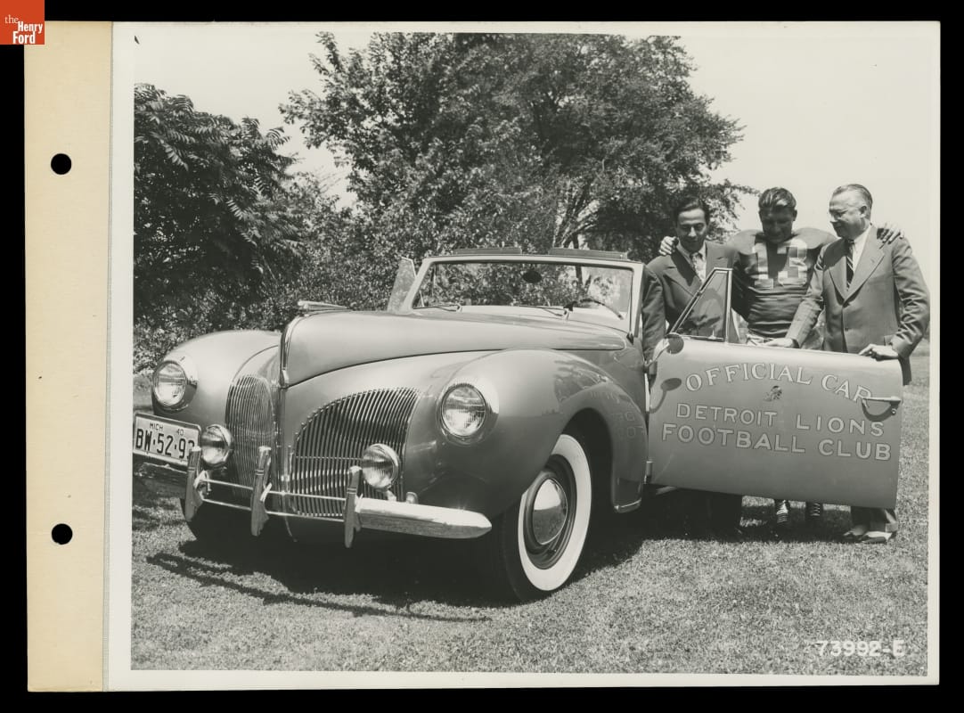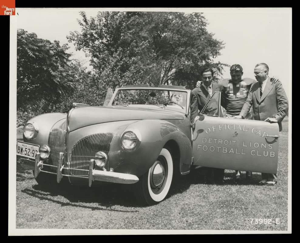 Football fans could thank Dearborn, Michigan, Ford dealers for presenting radio broadcasts of the 1940 Detroit Lions' season. Fans could tune into WJR each week to hear the play-by-play. In addition, dealers sponsored an August preseason show that featured news from the Lions' training camp and interviews with players. Photographs, like this one, helped promote local dealers and the Lions' games.