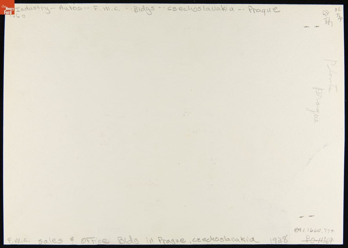 Ford Motor Company operated sales and service branches in cities around the world. This photograph shows the company's branch in Prague, Czechoslovakia, in 1928. Generally, Ford vehicles sold in Czechoslovakia at that time were assembled in the company's factory at Trieste, Italy.