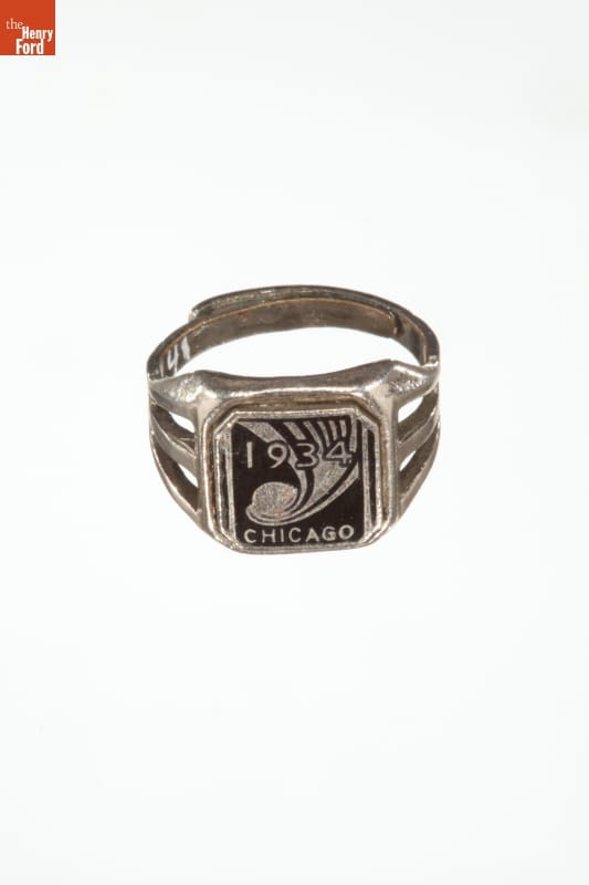 Chicago's 1933-34 Century of Progress Exposition used the theme of progress to buoy national optimism during the darkest years of the Great Depression. Many fairgoers returned home with mementos, such as jewelry, to serve as tangible reminders of time spent at the exposition.