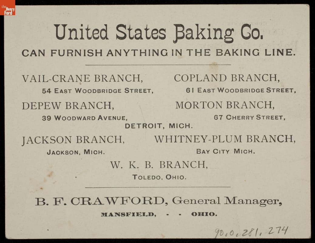 B.F. Crawford was the general manager of the United States Baking Co.'s Mansfield, Ohio branch. Other branches in Detroit, Jackson, and Bay City, Michigan, as well as Toledo, Ohio.