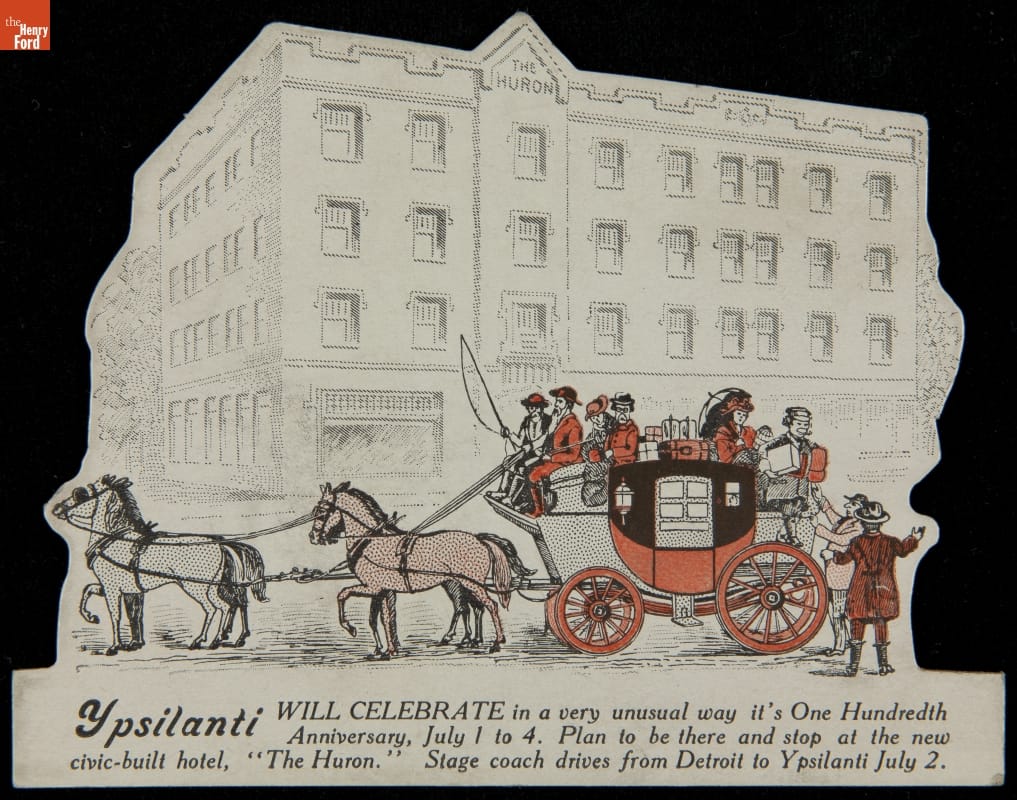Most Ypsilanti hotels were rundown by 1920, when local citizens were asked to contribute funds to a new hotel. The Huron Hotel, open January 1, 1923, elicited tremendous public interest and instilled great civic pride. This trade card advertises Ypsilanti's one hundredth anniversary, with a horse-drawn stagecoach that would stop in front of the "new civic-built hotel."