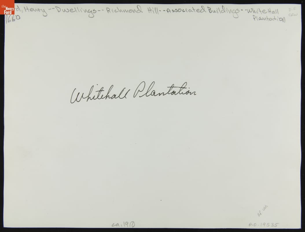 Henry Ford purchased vast amounts of land around present-day Richmond Hill, Georgia, beginning in the 1920s. Here, Ford dabbled in agricultural experimentation and in the late 1930s he built a winter residence. Ford's property included several large, pre-Civil War plantations. White Hall had been a prosperous cotton plantation. The large plantation house burned in 1914.