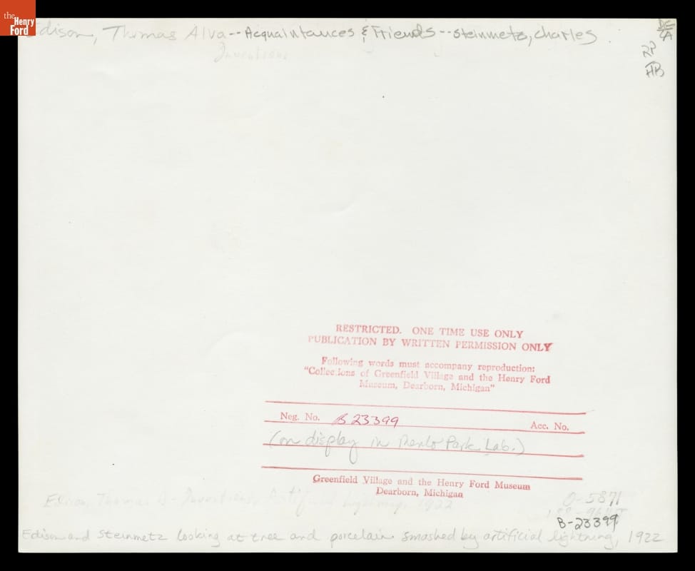 Thomas Edison and Charles Steinmetz Examining Porcelain Insulators Destroyed by Artificial Lightning, General Electric Research Laboratory, 1922