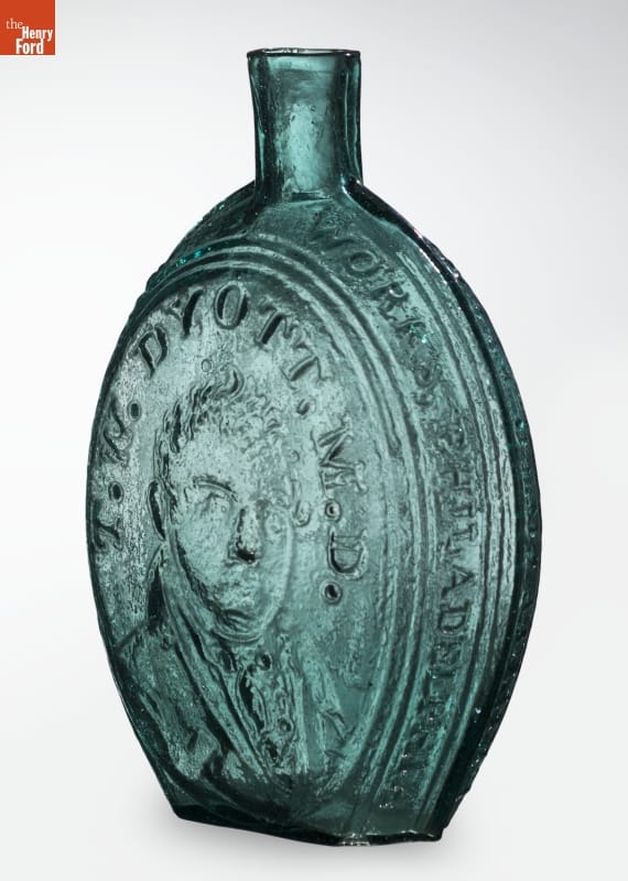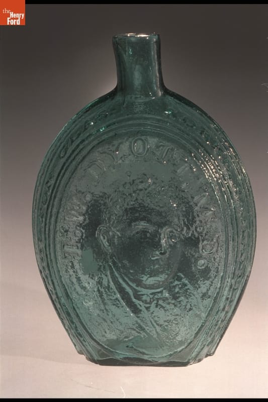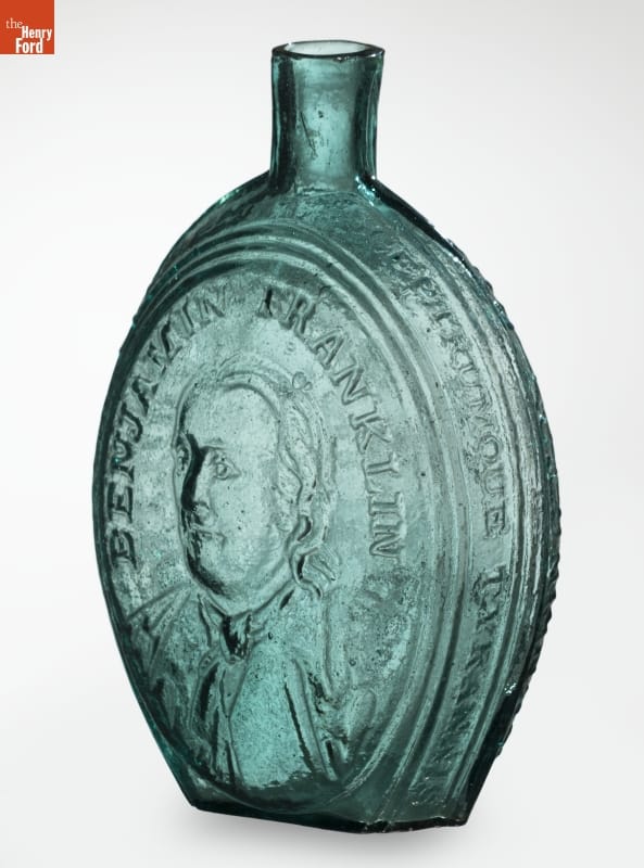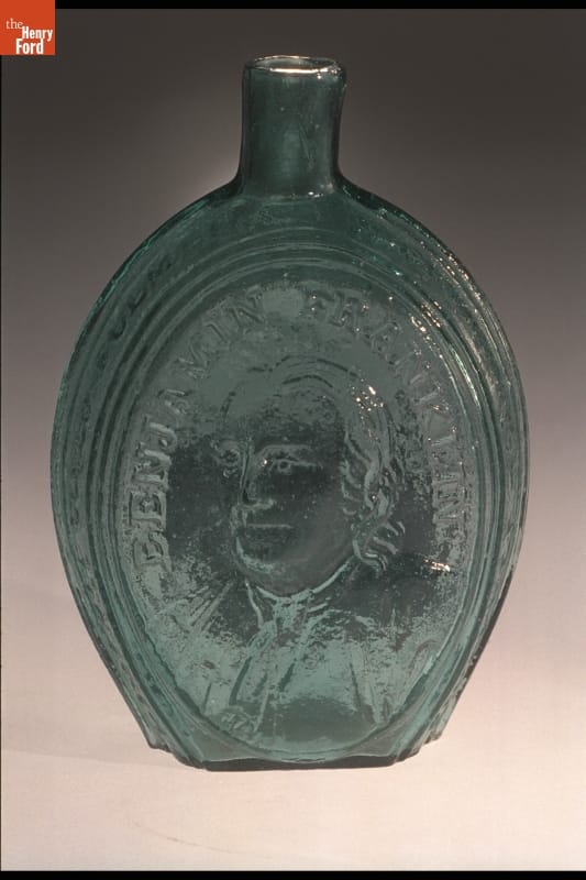 Glass factories in America began producing inexpensive, mold-formed flasks in the early 1800s. These figured flasks, often decorated with symbols of national pride or political or cultural affiliation, appealed to America's common man. Some of these flasks contain images of revered Revolutionary War-era patriots. Benjamin Franklin -- writer, philosopher, statesman and diplomat -- adorns this flask from the early 1800s.