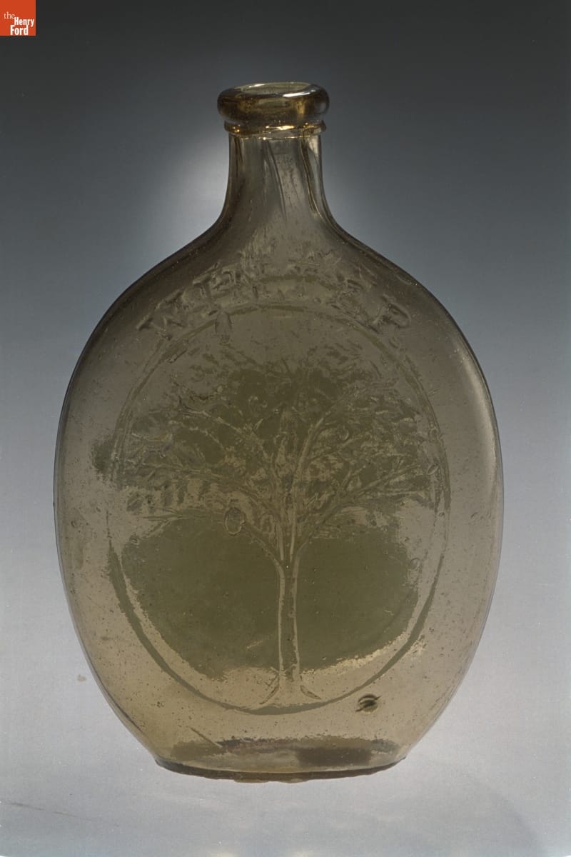 Glass factories in America began producing inexpensive, mold-formed flasks in the early 1800s. These figured flasks, often decorated with symbols of national pride or political or cultural affiliation, appealed to America's common man. Other images, like the tree, may have been purely decorative. Variation of this design include a tree in bloom (summer) and a tree without leaves (winter).