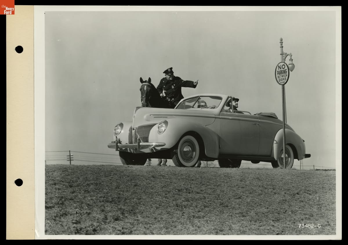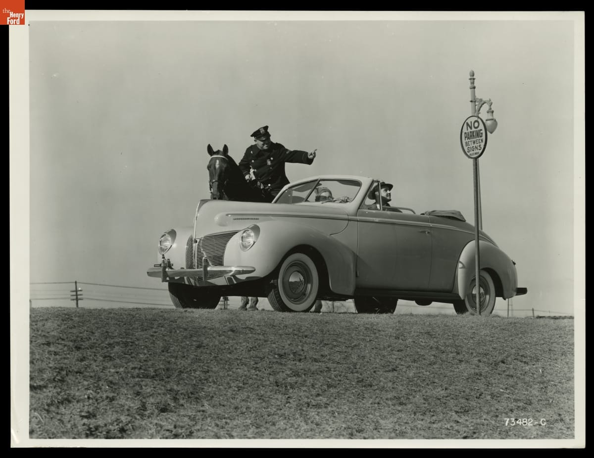 Police Officer on Horseback Showing a Driver the "No Parking" Sign on a Lamp Post, April 1940
