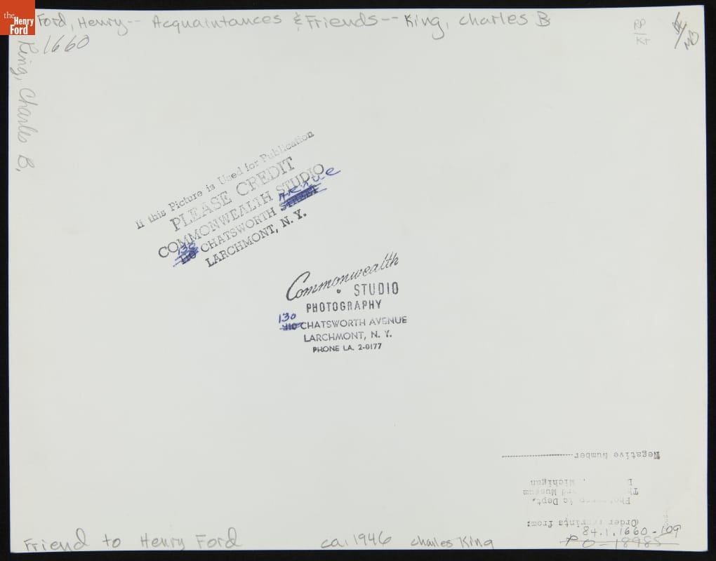 Charles Brady King built and drove the first automobile in Detroit in March 1896, three months before Henry Ford finished his Quadricycle. King left the auto business in 1912 to pursue other endeavors. Over the years, he assembled a significant collection of model ships and steam engines. King later gifted some of his model engines to Ford's museum.