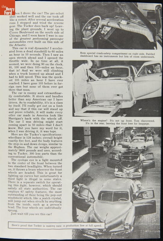 Automotive journalist Tom McCahill wrote glowingly of the Tucker 48 in the August 1948 issue of Mechanix Illustrated. McCahill praised the car's smooth ride, quick acceleration, and roomy interior. It was a welcome bit of good news for the Tucker Corporation, which was facing increasing financial and legal troubles. Tucker closed in 1950 after building just 51 cars.