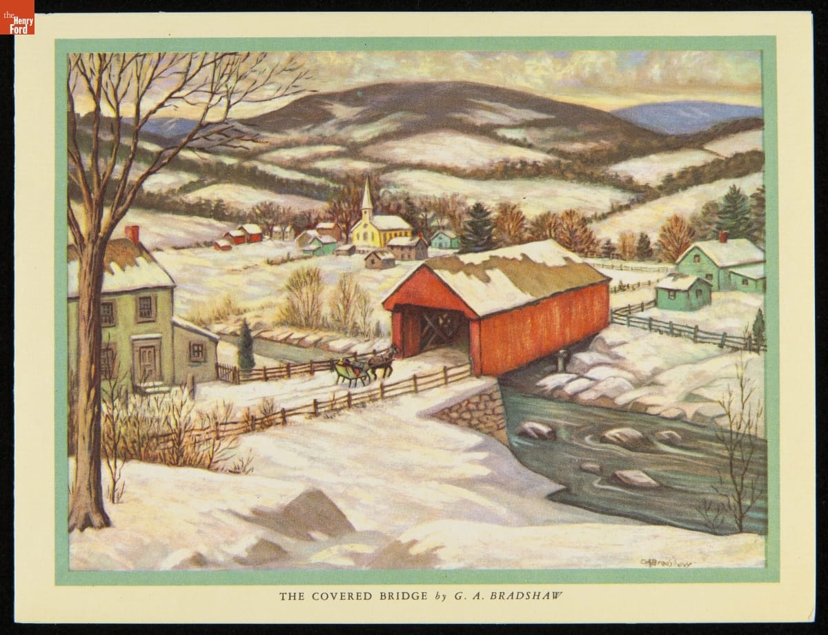 Mailing colorful, commercially designed greeting cards had become an American tradition by the 1920s and 1930s. Friends and neighbors commonly exchanged cards that wished one another a merry Christmas or happy New Year during the winter holidays. Publishers sometimes decorated these cards with nostalgic images of mills, churches, or covered bridges steeped in snow.