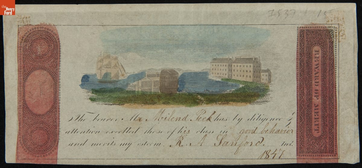 School Reward of Merit Given to Milend Peck by His Teacher R. A. Sanford, 1847