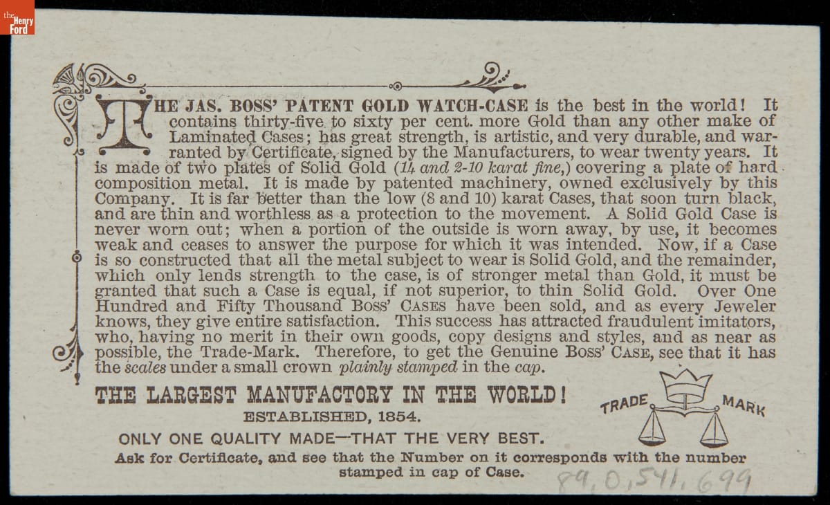 Trade Card for Boss Watch-Cases, Keystone Watch Case Company and Jeweler, F. J. Yesbera, 1875-1890
