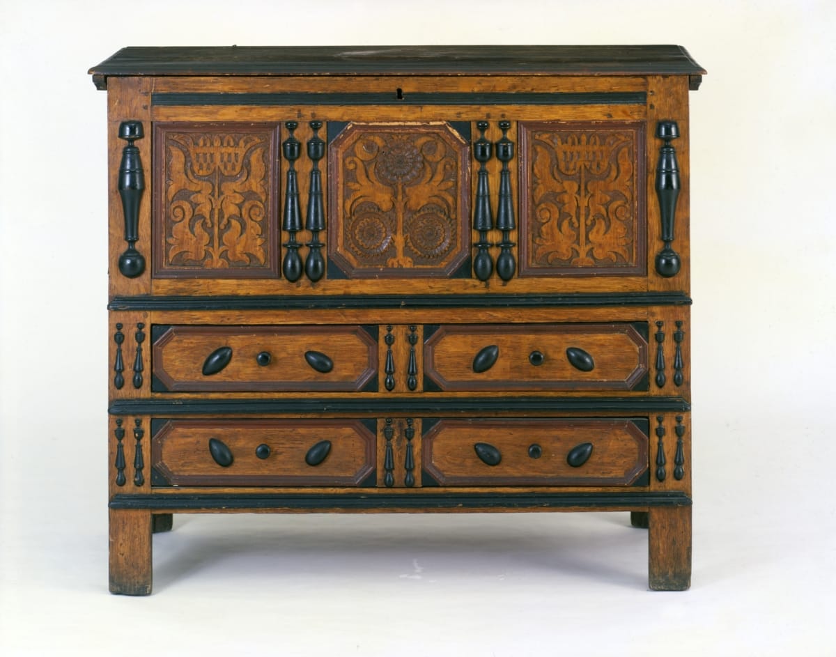 Chests of this type were made to hold linens, clothing, and other prized household possessions. This elaborate chest is decorated with carved flowers and vase-shaped turnings, designs copied from English sources.