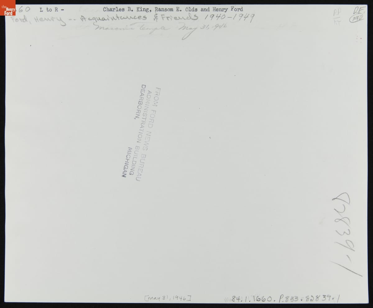 Charles B. King, Ransom Olds and Henry Ford at the Masonic Temple, Detroit, Michigan, 1946