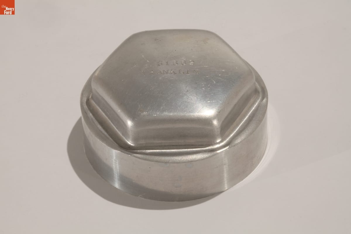 Early automobile wheels had a central hub with a greased wheel bearing. Hub caps kept grease in and dust out. Beginning in 1915, the Aluminum Goods Manufacturing Company of Manitowoc, Wisconsin, supplied hubcaps -- including this one -- to many automotive manufacturers. Hubcaps became functionally unnecessary as wheels evolved, but they remained important components of style and marketing.