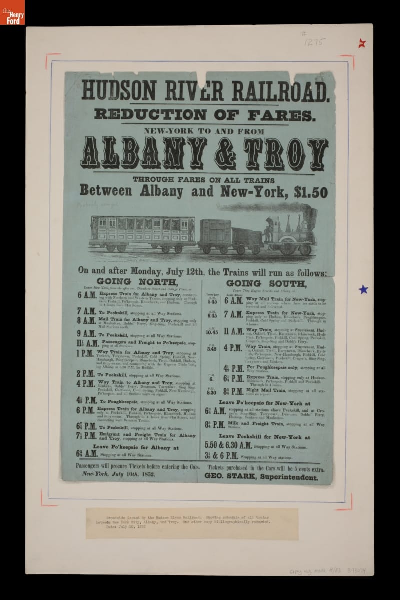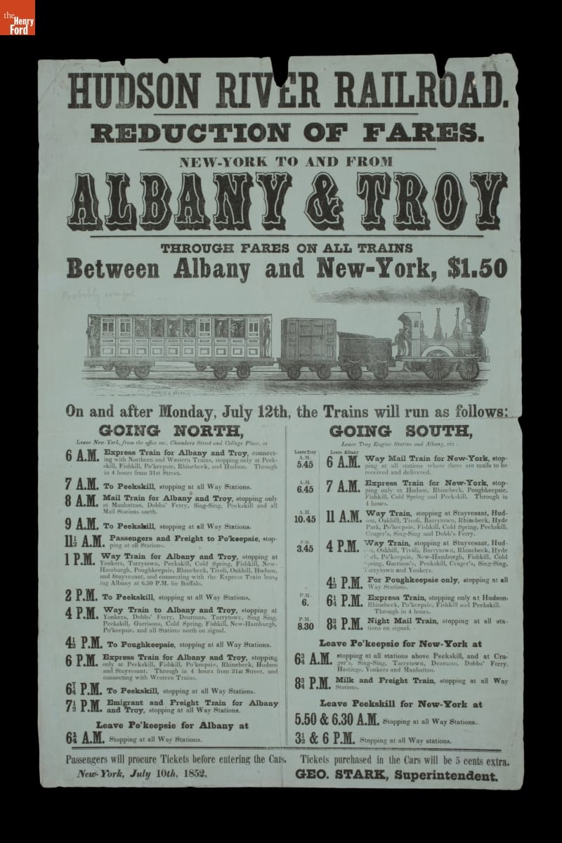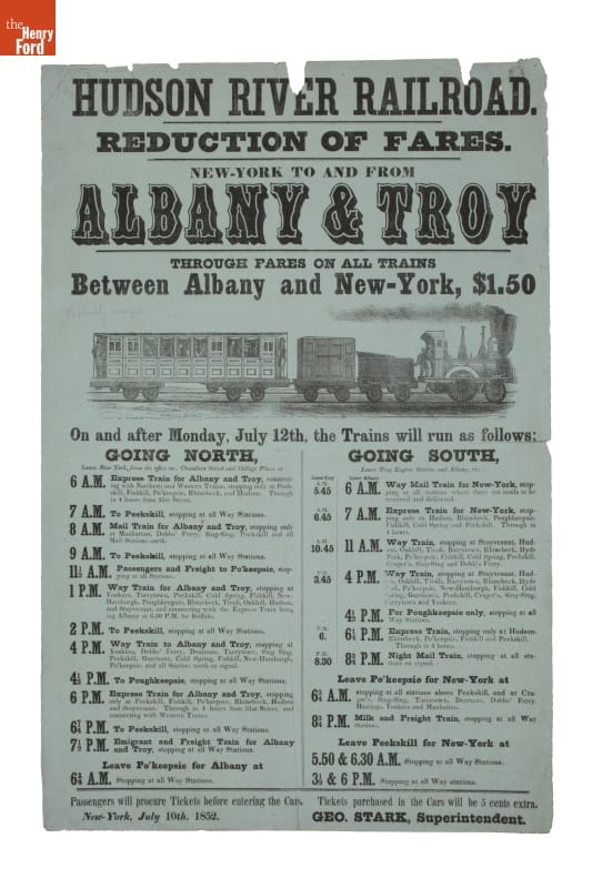 As the 19th century progressed, Americans had additional travel options. Railroads competed with steamboats for freight, mail, and passenger traffic. Rail routes often paralleled major river traffic routes. In 1852, the Hudson River Railroad offered travel to points along the river between New York City and Troy. This schedule shows the different travel schedules and options available to passengers.
