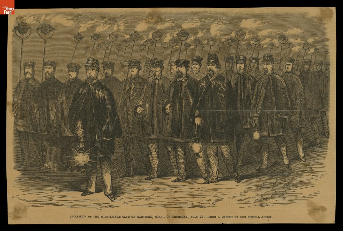 This wood engraving shows men marching in a political campaign parade in Hartford, Connecticut, on July 26, 1860. Part of a group known as the Wide Awakes, these men actively supported the Republican Party and their presidential candidate, Abraham Lincoln. Wearing unusual capes and black hats, and carrying flaming torches, the Wide Awakes marched in nighttime parades in the northern states.