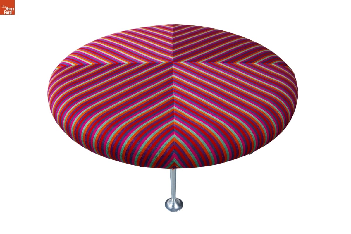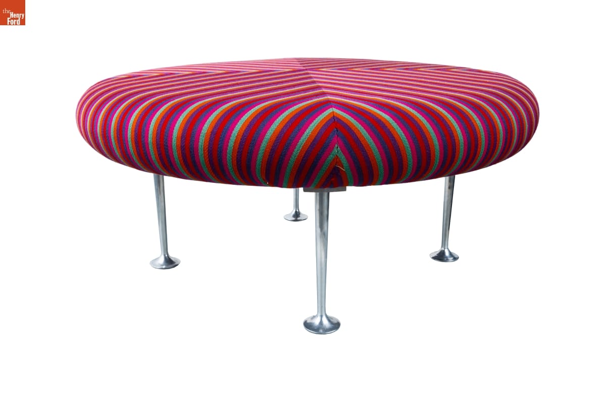 Alexander Girard was best known as a textile designer, but he also practiced architecture, graphic design, interior design, and furniture design. This ottoman design, initially created as part of Girard's large-scale redesign for Braniff International Airways, was later sold by Herman Miller Inc. in the Girard Group Series. Girard-designed textiles were available for the upholstery too -- this one features his colorful "Jacob's Coat" pattern.