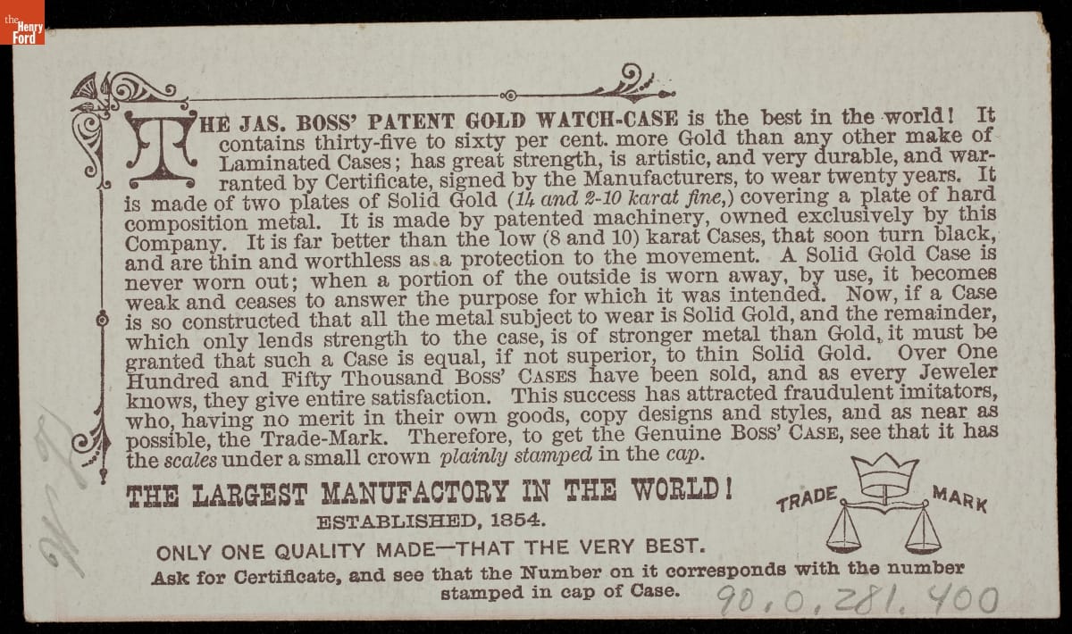 Trade Card for the Jason Boss' Watchcase, W.J. Brewster & Co., 1870-1900