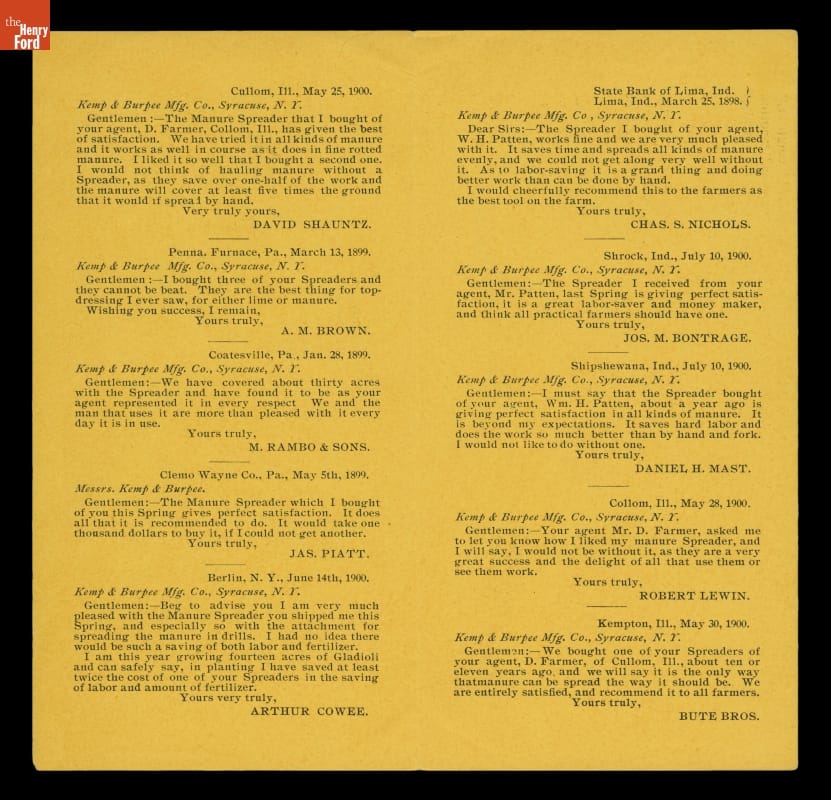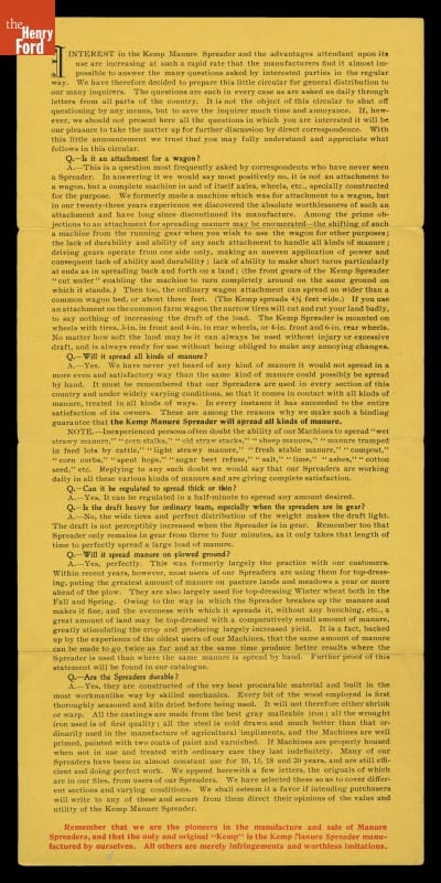 "Questions and Answers about The Only Original Kemp Manure Spreader," circa 1900