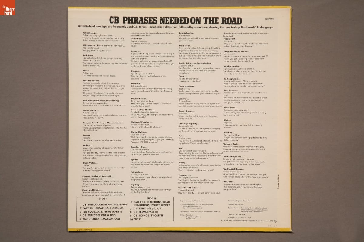 Truckers use citizens' band (CB) frequencies to talk to other truckers in their vicinity. In the 1970s, CB radio became a fad with drivers of all types. This record instructed the uninitiated in the truckers' language and culture.