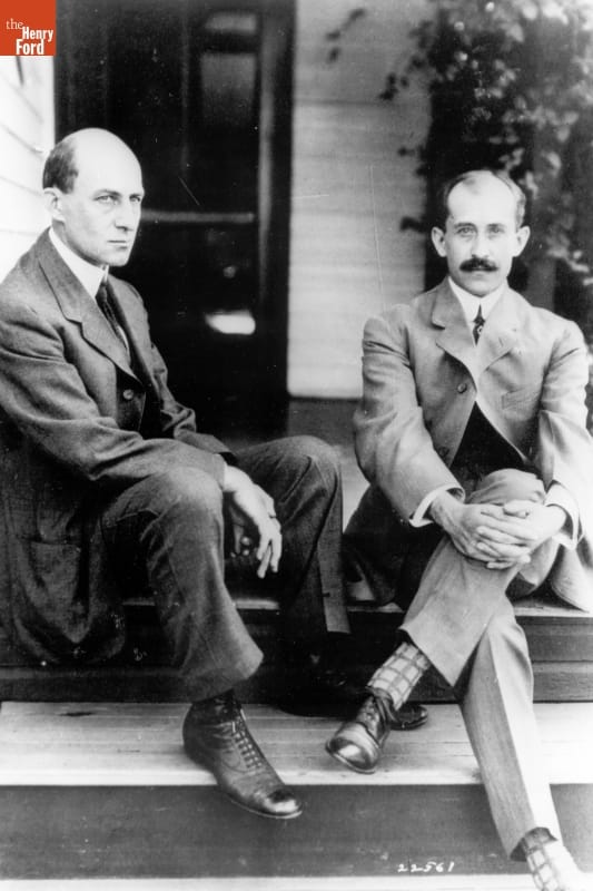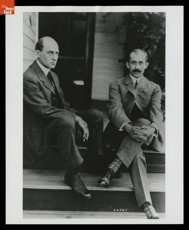 Wilbur and Orville Wright pose on the porch of the Wright family home in Dayton, Ohio. Neither of the brothers married or had children, and both continued to live with their father, Milton, and sister, Katharine. Without families of their own, the Wright brothers were free to devote increasing amounts of time and money to their aviation experiments.