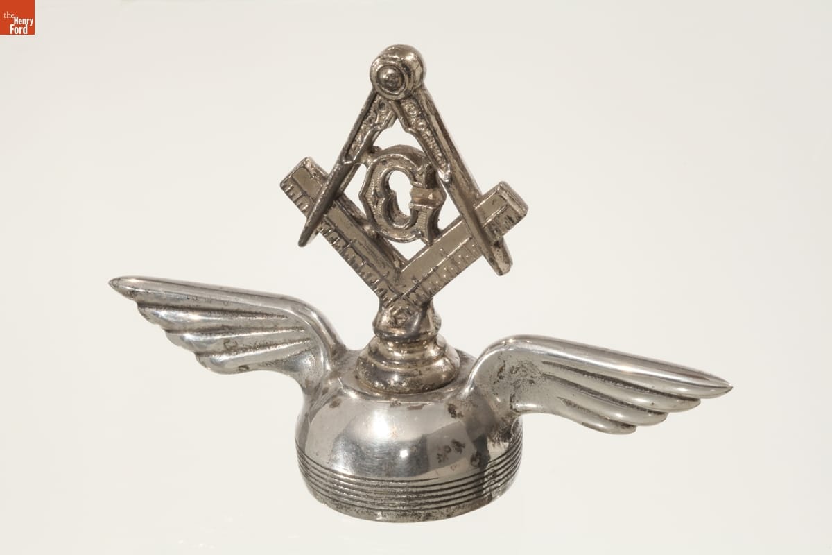 Car owners purchased aftermarket hood ornaments to express their individual personalities and beliefs. The buyer of this radiator cap, featuring the Square and Compasses symbol associated with Freemasonry, likely was a proud member of his local Masonic lodge -- and eager for others to know it.