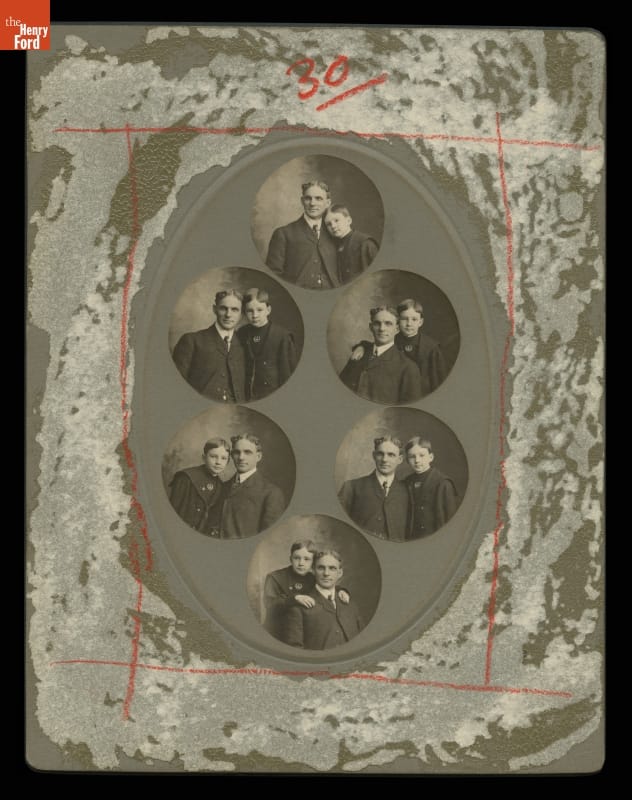 Edsel Bryant Ford, only child of Henry Ford and Clara Bryant Ford, was born November 6, 1893. Here eight-year-old Edsel poses with his father in a series of studio portraits. Perhaps not surprisingly, young Edsel was obsessed with automobiles. By age ten he could drive a Model A, the first car built by his father's Ford Motor Company.