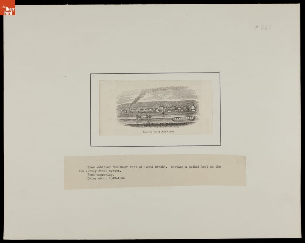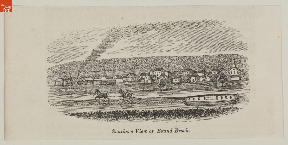 This 1840s engraving features the Delaware & Raritan Canal at Bound Brook, New Jersey. There are two horses pulling a packet boat on the canal, with the southern view of Bound Brook, New Jersey, behind them.