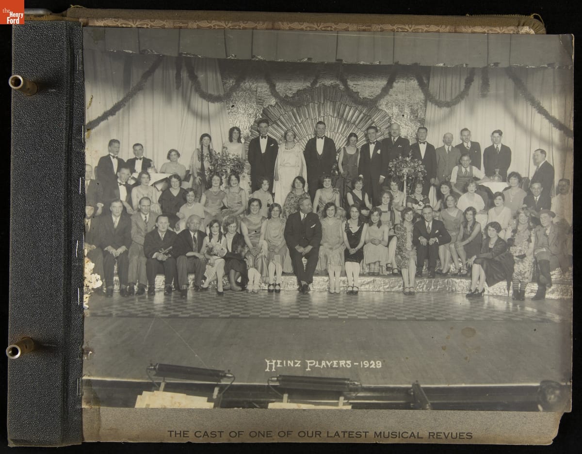 Company scrapbooks are often reminders of the company's history, significant moments in time, and the employees who worked there. This album, compiled by the H. J. Heinz Company, includes photographs from the Heinz Girls' 57 Club banquets and bowling league. Other photographs feature the actors and actresses of the Heinz Players group and Howard Heinz with employees at the branch factory in London.