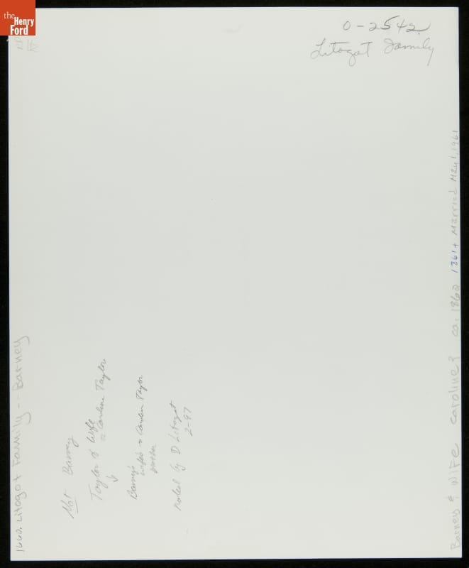 Barney Litogot married Caroline Taylor in Huron, Michigan, in May 1861. This photograph may have been taken about the time of their marriage, or perhaps shortly before Barney enlisted in a Michigan regiment in August 1862. This Civil War soldier -- an uncle of Henry Ford -- would return home to his young wife three years later. Their infant son died while Litogot was away at war.