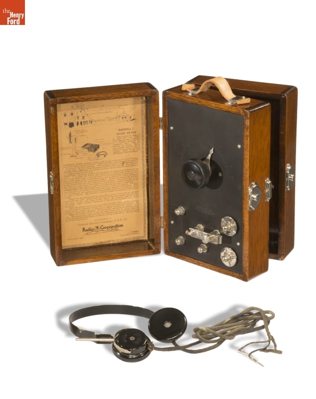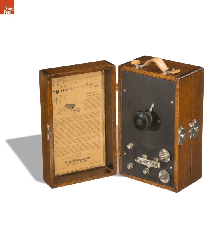 In late 1922, RCA began marketing all of their radio receivers under the Radiola trade name--this particular set straddled that changeover. This crystal-detector broadcast receiver allowed the listener to hear stations ten to twenty miles away. Advertisements promoted its simple design, which could be "opened like a book," and portability that allowed it to be "carried like a satchel."