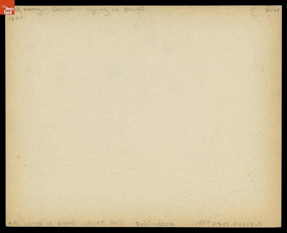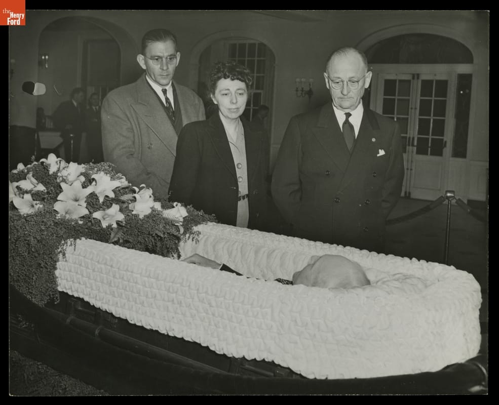 Henry Ford died on April 7, 1947, at his Fair Lane estate in Dearborn, Michigan. Thousands mourned his death. Before his funeral, Ford's body lay in repose in the lobby of what is now Lovett Hall near Greenfield Village. Many waited in a mile-long line to pay their last respects to the automotive pioneer.