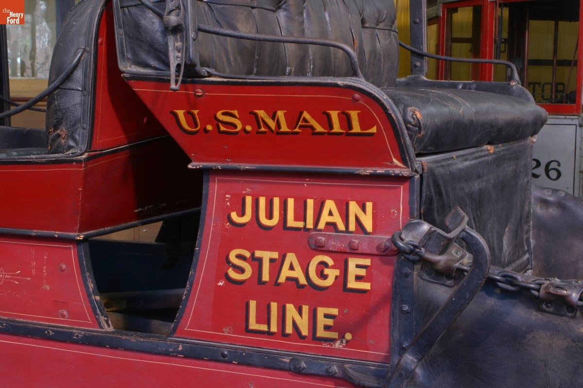 Painted in gold leaf on each side of the driver's seat: U. S. MAIL / JULIAN / STAGE / LINE