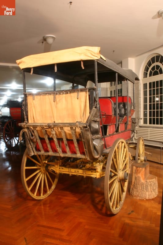 If they couldn't go by railroad, Americans often traveled by stagecoach -- even into the early 20th century. Stage lines moved their vehicles in "stages" with continual relays of fresh horses. Open-sided wagons were lighter and less expensive than closed coaches. Canvas curtains protected passengers from bad weather. The Julian Stage Line operated in San Diego County, California.