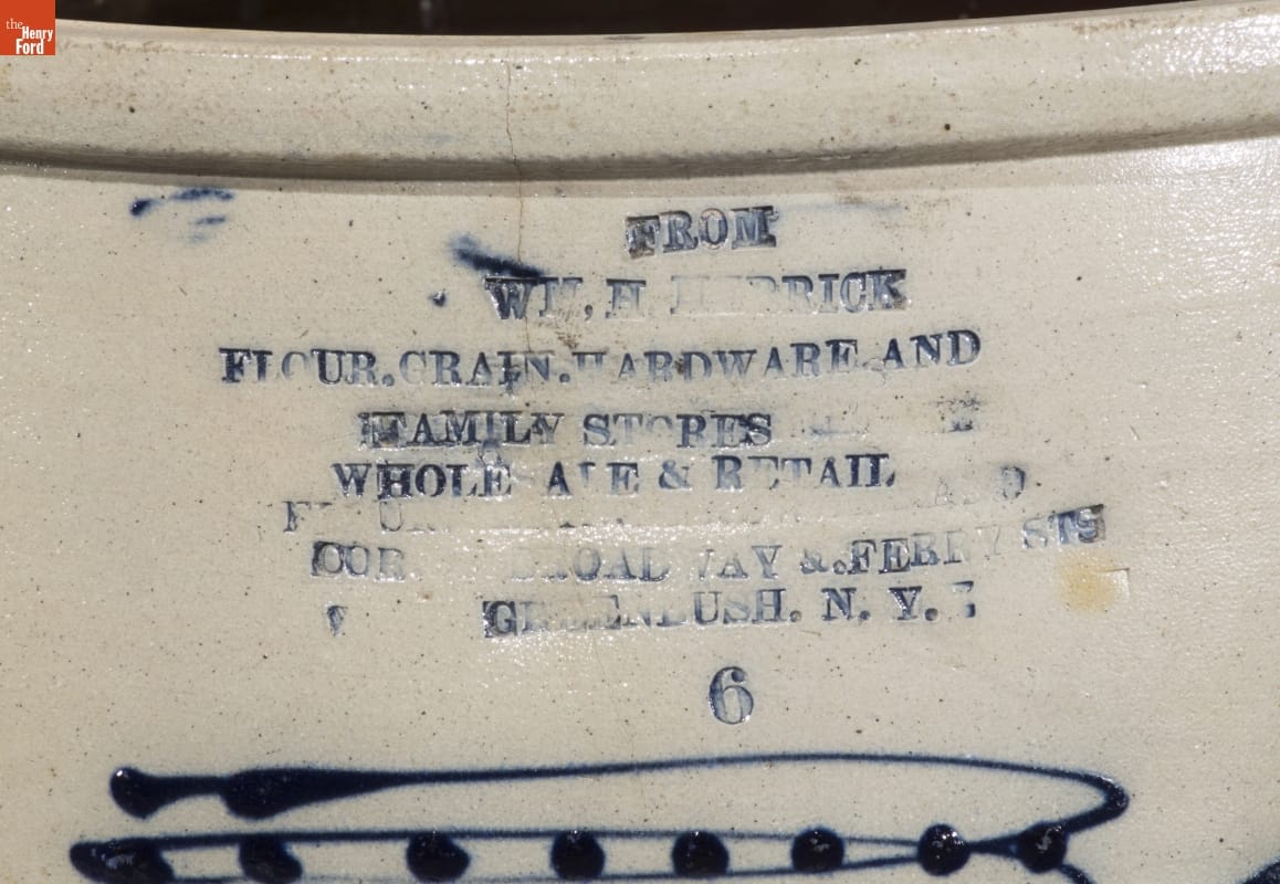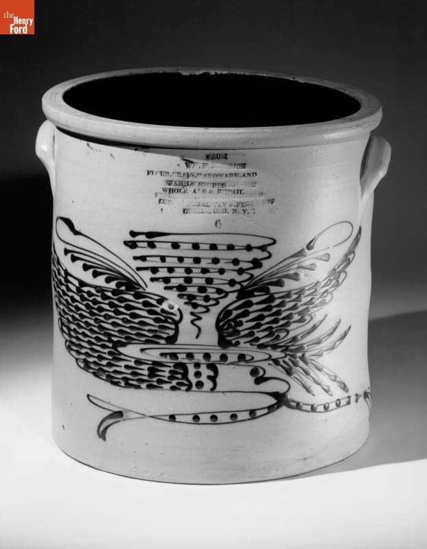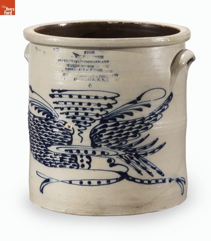 This crock was made of a durable, leak-proof pottery called stoneware, shaped on a potter's wheel. The orange-peel-like outer glaze was created when the potter threw handfuls of common rock salt into a white-hot kiln during the piece's firing. Salt-glazed stoneware pieces were decorated with an amazing array of designs, including the patriotic motifs on this piece.