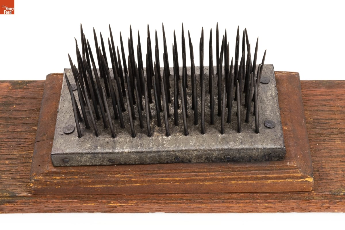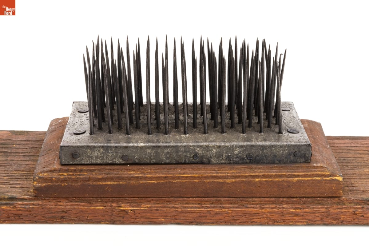 Producing linen yarn by hand from the flax plant is labor-intensive and time-consuming. The useable fibers of the plant are encased in a hard outer coating in the stem. After this coating is removed, the fibers are drawn through a series of hackles--boards with sharp metal spikes--to align the long fibers and remove debris and short fibers.