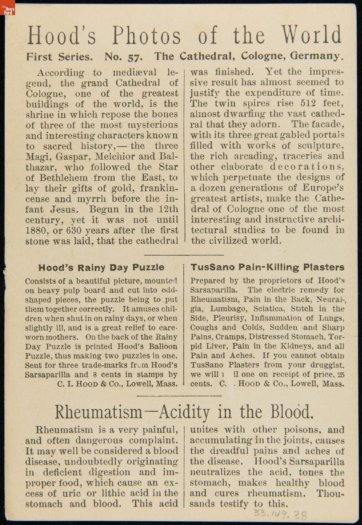 Trade Card for C.I. Hood & Co. with Hood's Photos of the World, "Cathedral of Cologne, Germany," 1890-1910