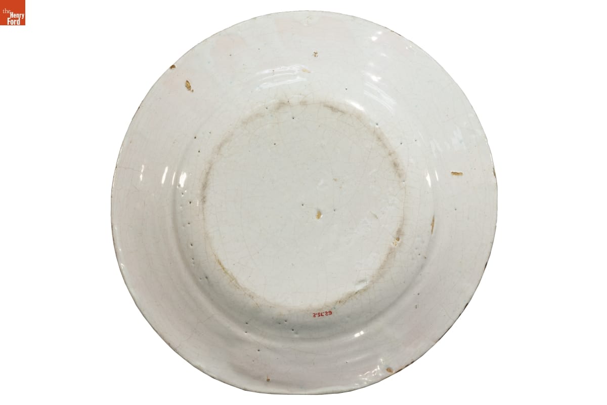 A well-to-do family in the late-17th century displayed decorated plates like this one on a table or in an open cupboard. The dishes, not used as common serving items, showed the owner's wealth and good taste. The plate's decorative motifs varied, but popular themes included: images of royalty, biblical stories, flowers, and may also have the owner's initials and a date.