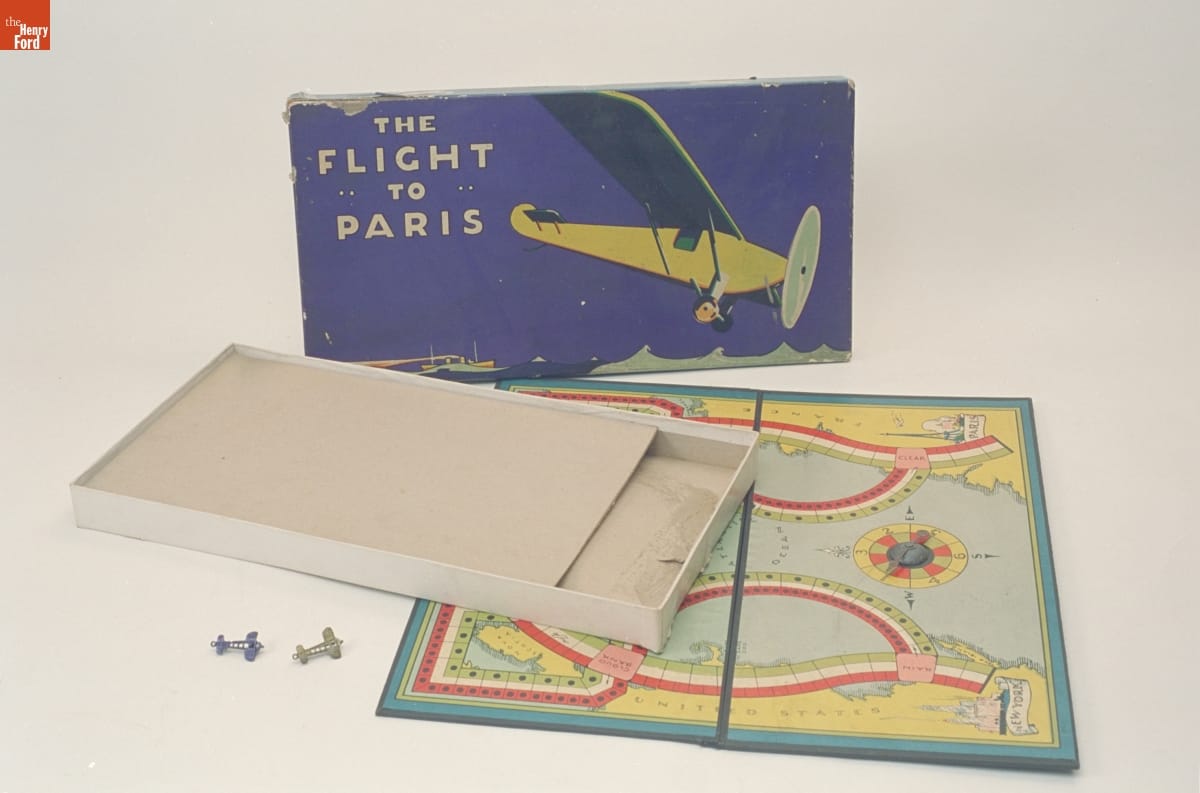 In 1927, Charles Lindbergh became the first person to fly solo across the Atlantic. Americans were captivated by this amazing feat. Manufacturers capitalized on the public's fascination with the flight, producing an avalanche of related goods. In this board game from the Milton Bradley Company, players navigated spaces labeled with some of the weather challenges real pilots faced: clouds, fog, rain, and sleet.