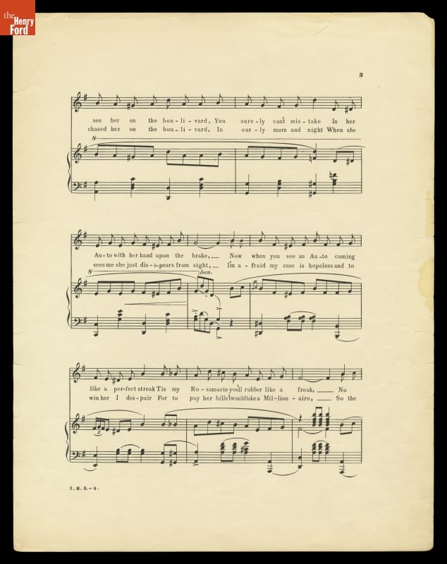 In this comic song from 1901, a fearless young woman enjoys driving fast in her automobile. Women drivers were uncommon before the mid-1910s.